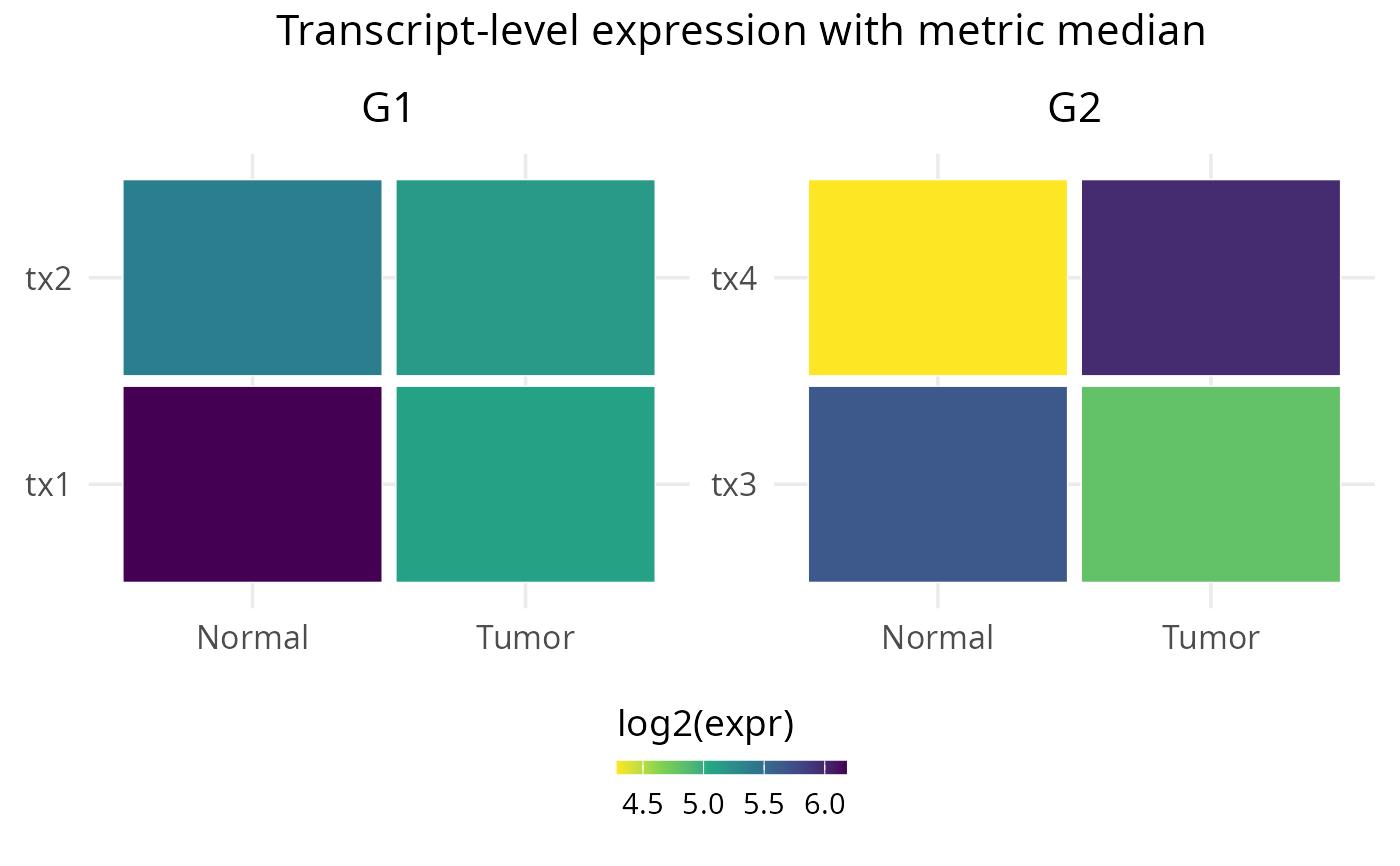 Aggregation metric used to summarize transcript expression per group when plotting. One of c("median", "mean", "variance", "iqr"). Use "iqr" to compute the interquartile range. Defaults to "median".